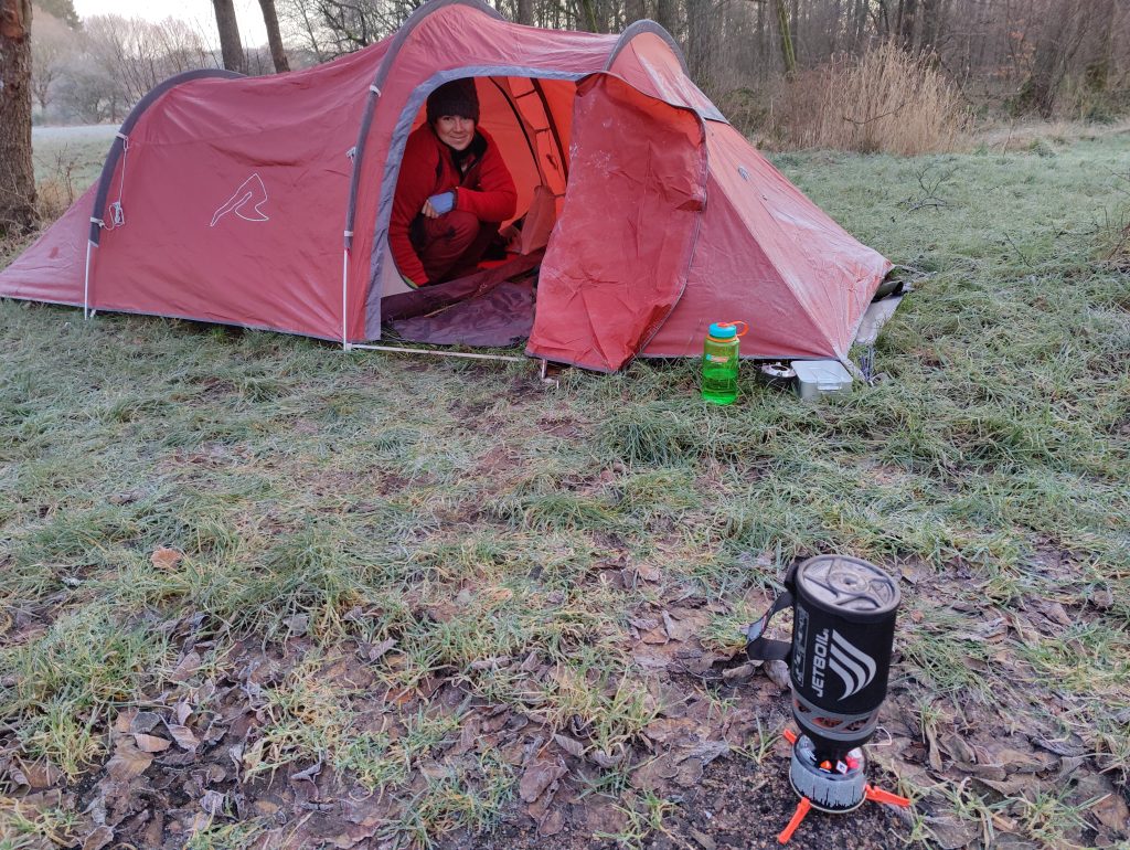 Dette blev opgraderet til et 3-personers Robens Voyager 3EX. Vejer omkring 3200 gram. Dette har vi brugt på kæresteture + hund – igen i frostvejr i Danmark på en tur rundt om Silkeborgsøerne.
